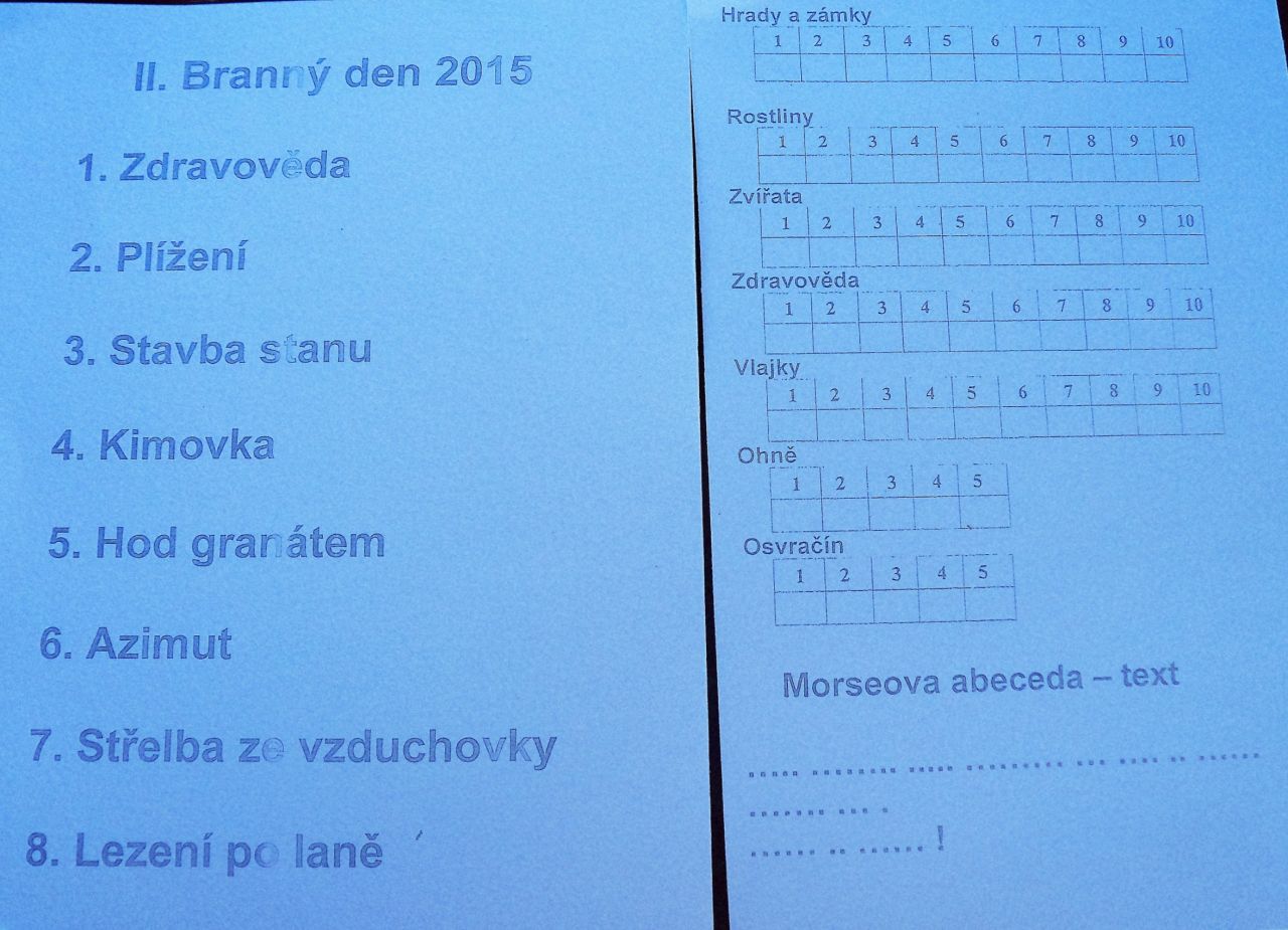 Neplánovanou akcí byl Branný závod ( 29. 8.) rodičů s dětmi. Na trase plnili účastníci různé disciplíny jako např. plížení, znalost topografických značek, přírodovědy, Morseovy abecedy, dovednost střelby a slaňování . Zahajovací závod se všem líbil. Všichni účastníci obdrželi pamětní list a sladkou odměnu.